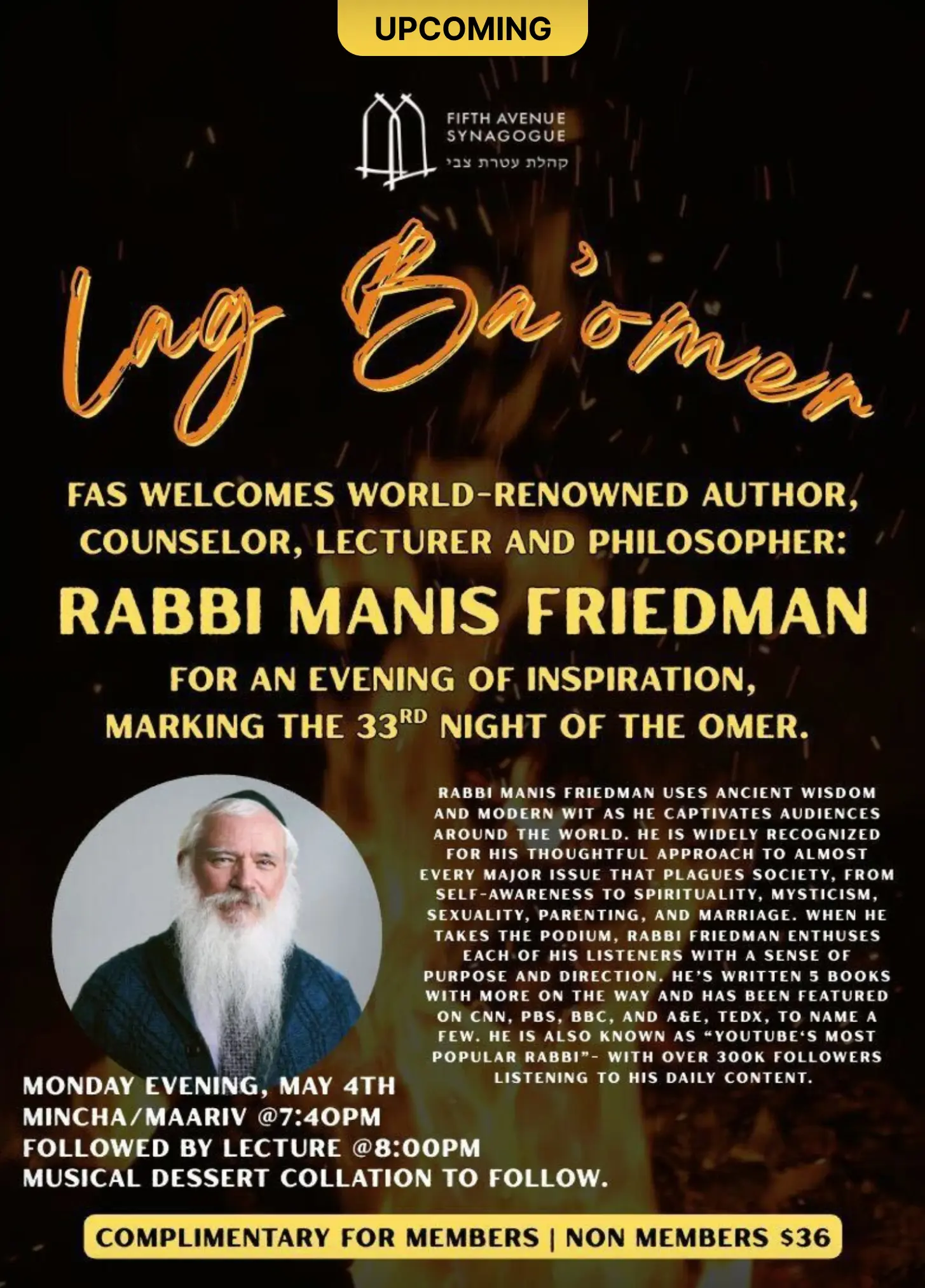 “I’ve been watching Rabbi Friedman’s talks for over a decade. In every phase of my life: single, married, parent, struggling, rebuilding—I’ve returned to his teachings and heard something new. Rabbi Manis is a fount of knowledge in the truest sense, and his wisdom and clarity of thought gave me a life manual and a safety net to fall back on. His guidance grows as you grow, and he has advice for any stage or age.”